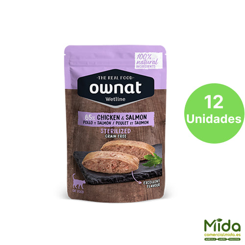 OWNAT Wetline Sterilized Chicken and Salmon, receta orientada a gatos esterilizados, que suelen presentar menor gasto energético y mayor tendencia al aumento de peso, por lo que un bajo % de grasa resulta coherente con el objetivo de control calórico.