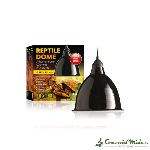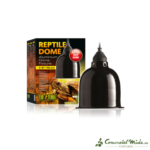 El Reptile Dome Exo Terra es un portalámparas versátil diseñado para adaptarse a una amplia gama de bombillas fluorescentes compactas e incandescentes, permitiendo colocar fuentes de calor y luz en el terrario según las necesidades del reptil. Su cúpula reflectora de aluminio extraprofunda no solo proporciona una mayor cobertura para la bombilla, sino que maximiza la salida de luz y la emisión de rayos UVA y UVB, asegurando una iluminación más eficiente en el hábitat.