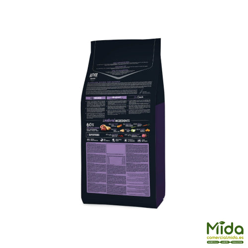 60% carne fresca total: combinación de pato y pollo frescos para alta palatabilidad y calidad proteica.