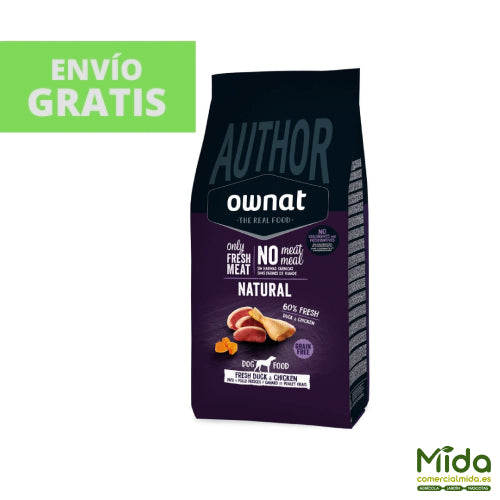 OWNAT Author Grain Free Fresh Duck & Chicken es un alimento completo para perros adultos, formulado sin cereales y con una combinación de carnes frescas de pato y pollo en porcentajes elevados (60% en total). Esta base proteica animal aporta alta palatabilidad (“irresistible”) y un perfil nutricional de alta calidad. La receta se complementa con bayas de goji como fuente natural de antioxidantes y harpagófito, orientado a ayudar a la respuesta inflamatoria. Incorpora además vegetales y frutas (manzana, zanahoria, calabaza) y prebióticos (FOS/MOS) para soporte digestivo.