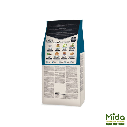 Vollständige und ausgewogene Nahrung, basierend auf frischem Fisch und völlig natürlichen Zutaten. Verbessert die Elastizität und Festigkeit von Haar und Haut von Hunden jeden Alters und jeder Rasse.