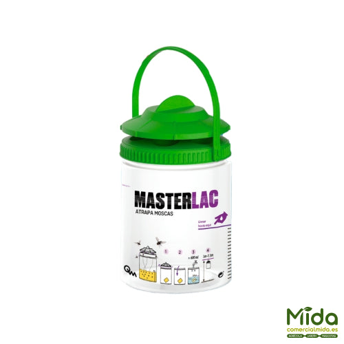 Quimunsa MASTERLAC Atrapa Moscas Trampa Reutilizable es una trampa de exterior con cebo atrayente 0% insecticidas que permite capturar hasta 18.000 moscas por ciclo. Su formulación con huevo y levadura genera un olor altamente atractivo, de modo que las moscas entran y quedan retenidas en el recipiente. La acción atrayente se mantiene hasta 15 días; pasado ese período la trampa sigue capturando, aunque con menor intensidad. El sistema es reutilizable: basta con rellenar con agua para activar el cebo y renovar cuando sea necesario