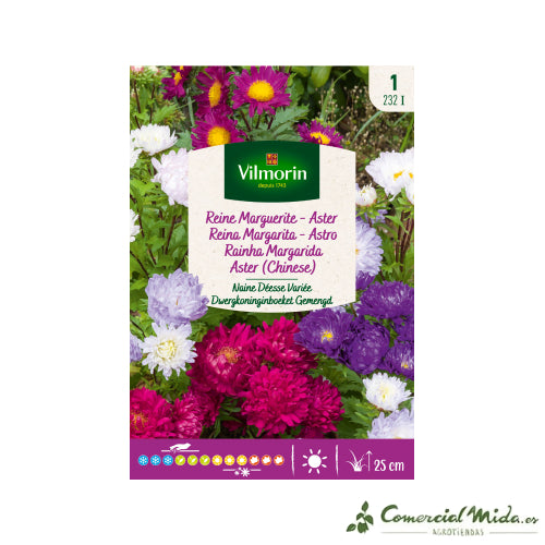 La Reina Margarita Enana Diosa Variada de Vilmorin es una planta anual compacta que se distingue por sus flores dobles perfectamente redondeadas, de colores vibrantes y variados. Esta variedad enana es robusta, fácil de cultivar y perfecta para dar un toque ornamental a macizos en zonas sombreadas o de luz parcial. Ideal para combinaciones florales de gran impacto.